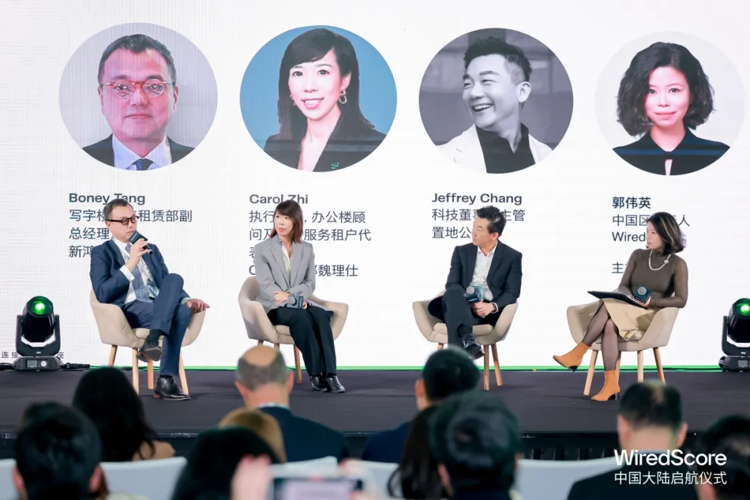 WiredScore中国区负责人郭伟英与新鸿基地产写字楼销售租赁部副总经理Boney Tang、CBRE世邦魏理仕执行董事, 办公楼顾问及交易服务租户代表负责人Carol Zhi及香港置地科技董事及主管Jeffrey Chang共同探讨中国房地产的趋势与技术演进